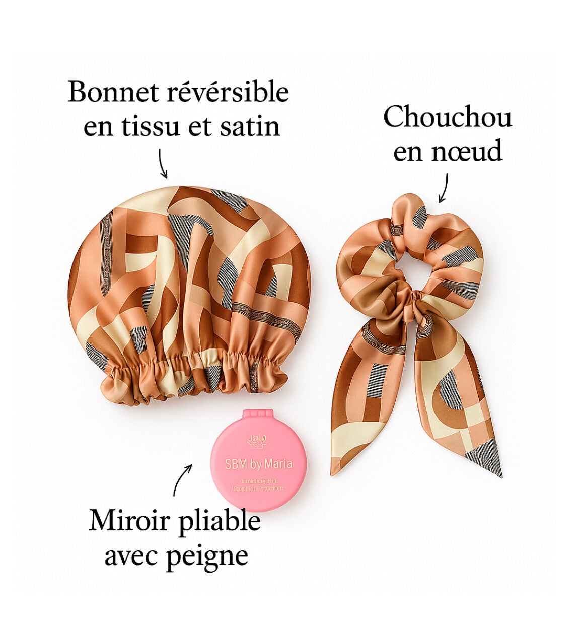 Ensemble “Sublime Élégance” – Bonnet réversible , Chouchou & Miroir Peigne Pliable (Fait main) couleur rose